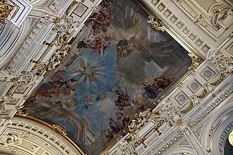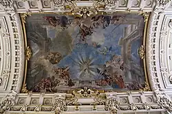 Un fresco alegórico de 200 m² cubre gran parte de la bóveda central, con el motivo del Triunfo de la Justicia, rodeado de decoraciones varias de color dorado. El elemento céntrico de esta obra de Károly Lotz, quien la basó en la pintura de Andrea Pozzo en la iglesia de San Ignacio de Loyola de Roma,[3] es la Dama de la Justicia en su gloria divina, rodeada de figuras alegóricas del poder protector de la ley y el derecho.[2] El fondo de la pintura retrata la bóveda como si fuera una ventana de cristal, sobre la cual se distingue la continuación del edificio con dos grandes arcos a ambos lados, y por encima de todo un cielo nublado. Las representaciones de la Justicia y algunas de las figuras posan en lo alto de un ático que también forma parte del edificio, mientras que el genio que imparte la justicia aparece al otro lado del fresco, directamente enfrente, también posado rodeado de figuras en un pedestal de la misma altura.