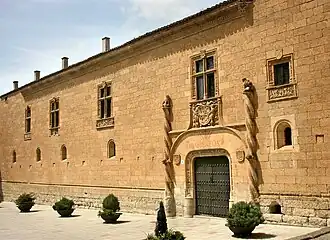 La portada con sus escudos; en el central, primorosamente labrado, los castillos y el león representan el linaje de Enríquez; el segundo cuartel es el conocido león con la estrella y la flor de lis de los Núñez de Ciudad Rodrigo; y el tercero, las cinco caras surmontadas de un yelmo que se refiere a los Caraveo. Las estrellas y las lises, de los Núñez de Ciudad Rodrigo, se escogen como motivo decorativo de algunas de las ventanas del Palacio.