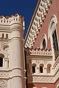 La fachada del edificio da al parque del palacio; tiene incorporada en su esquina oriental una torre campanario al estilo campanile de cuatro pisos y 34 metros de altura.[12] En la esquina oeste, identificable desde el exterior por su ábside semicircular, se encuentra la capilla de dos plantas; mientras que en la esquina norte de la propiedad destaca un amplio avant-corps, cuyo hastial está realzado por una galería enana y un merlón almenado. Por delante de la fachada principal se extiende un amplio balcón, bajo el cual se encuentra la entrada principal al edificio. La balaustrada, dividida en arcos conopiales y rosetones, descansa sobre columnas de perfil esbelto. Los frontones a dos aguas en las fachadas sureste y norte son casi idénticos. De hecho, muchos de los elementos arquitectónicos del edificio, con su particular decoración, se repiten en todos los frentes; estos incluyen las ventanas de arco de medio punto, las galerías enanas translúcidas bajo el socarrén, las torrecillas esquineras con sus paneles almenados y las galerías abiertas que dan hacia el patio.