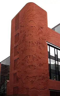 Fachada en ángulo, donde se aprecia la representación de un gigantesco árbol en ladrillo rojo