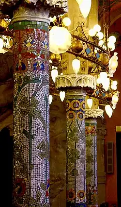 Columnas del segundo piso, decoradas con mosaicos de Lluís Bru