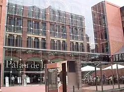 En la parte izquierda de la fachada se encuentra el edificio de servicios, realizado por los arquitectos Óscar Tusquets, Lluís Clotet y Carles Díaz en la última veintena del siglo XX, con una torre con la base esculpida como si de una gran palmera se tratara, es también, por donde hay la entrada de los artistas. En la parte derecha se encuentra sobre unas escaleras la escultura dedicada a Lluís Millet, del escultor Josep Salvadó Jassans realizada en 1991 y la entrada al restaurante del palacio, llamado Mirador y realizado como una caja de cristal. En este extremo de la fachada el ángulo con la calle Alta de San Pedro, también se resuelve a manera de proa como en la fachada antigua, representando en ladrillo rojo y en bajo relieve, un gigantesco Árbol de la Vida realizado por el escultor barcelonés Naxo Farreras.