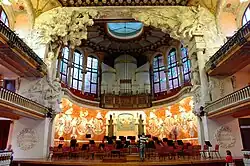 El Palacio de la Música Catalana[1]​ (en catalán: Palau de la Música Catalana) es un auditorio de música situado en la calle Alta de San Pedro en el barrio de la Ribera de Barcelona, España. Fue proyectado por el arquitecto barcelonés Lluís Domènech i Montaner, uno de los máximos representantes del modernismo catalán. La construcción se llevó a cabo entre los años 1905 y 1908, con soluciones en la estructura muy avanzadas con la aplicación de grandes muros de cristal y la integración de otras artes como escultura, mosaicos, vitrales y forja.[2]​ El edificio, sede central del Orfeón Catalán, fundado en 1891 por Lluís Millet y Amadeo Vives, fue sufragado por industriales y financieros catalanes, ilustrados y amantes de la música, estamento que sesenta años antes ya había financiado el teatro de ópera y ballet Gran Teatro del Liceo.