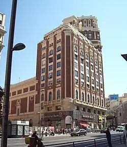 El diseño comenzó en 1924 y las obras comenzaron en el año 1925, la primera piedra fue colocada por el rey Alfonso XIII el día 11 de julio de 1925. Cuatro años tardó en construirse el edificio que mostraba como originalidad la construcción de la fachada en ladrillo visto.[6] Denominado inicialmente como Casa de la Prensa. El estilo del edificio es de clasicismo moderno.[7] Se inauguró oficialmente el 7 de abril de 1930 con la presencia de los reyes Alfonso XIII y Victoria Eugenia, junto con el Gobierno representado por el general Dámaso Berenguer.[3] Al acto acudieron numerosas representaciones de Europa e Hispanoamérica. El coste de la edificación fue de ocho millones de pesetas. Este encargo de la Asociación de la Prensa madrileña abrió un espacio para la ubicación de un edificio que mirara a la plaza del Callao (asociación que cumplía treinta años de existencia). Concebido como un edificio multifuncional, albergaba un café concierto, un cinematógrafo, viviendas de alquiler y oficinas. El arquitecto Pedro Muguruza Otaño se vio influenciado por López Otero y Antonio Palacios.[8]