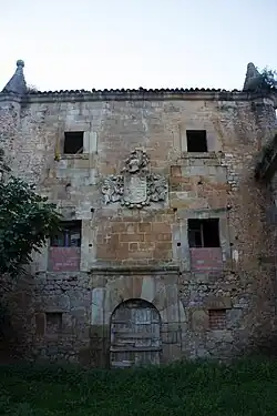 En la parte trasera del edificio principal y adosado a él, encontramos el torreón, con cuatro machones o cubos circulares y una puerta de medio punto con el lema familiar: Arbor bona, bonos fructus fecit.
