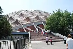 Estéticamente, la estructura semeja una gran carpa con sus postes y con sus «amarres» anclados. Arquitectónicamente, la planta del edificio es circular, con una cúpula geodésica compuesta por cuadros que abarca 120 m de diámetro y que comprende un área aproximada de 27.000 m2.. La cúpula se compone de paraboloides hiperbólicos de aluminio tubular cubiertos por una subestructura de láminas de madera forradas de una aleación de cobre y estaño resistente al agua, sustentadas en grandes arcos de acero.[2] Decenas de pilares de concreto cubiertos con ladrillo en los cuatro costados actúan como contrafuertes de la estructura de la cúpula, además de dar forma a pórticos de acceso al recinto. Los pilares más esbeltos e inclinados en forma de V fungen como soportes hacia la estructura externa, que forma una primera rampa que circunda al recinto.