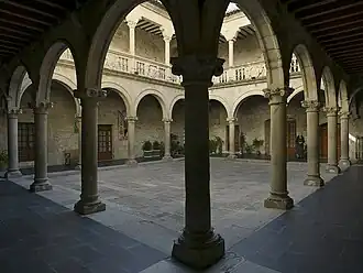 En el patio se observa la escalera de caracol de sillería de granito rematada en cupulín que da acceso a los pisos altos. La antigua escalera principal no se conserva hoy, habiendo sido sustituida por otra más recogida.
