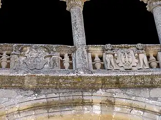 El arco soporta una hermosa y aireada galería de columnas jónicas sin estrías con cuatro vanos, cuyos dinteles se sustentan sobre sendas artísticas y robustas zapatas de doble ménsula de piedra en los capiteles, decoradas con rosas.[5]Los balaustres aparecen ensogados, y en los dos centrales dos niños y dos niñas tenantes con cartelas muestran las armas de los linajes ya señalados.