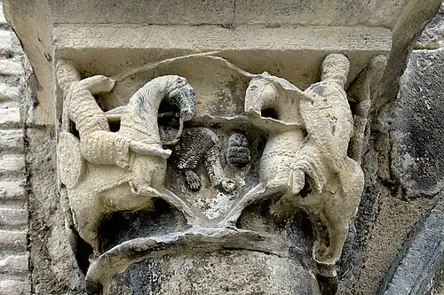 En la columna de la parte izquierda de la fachada principal se encuentra el capitel con figuras de formas estilizadas que narran un episodio legendario de Roldán, en concreto la escena de la lucha de Roldán contra el gigante Ferragut, intentando ejemplificar la lucha del bien contra el mal. Está firmado por el escultor Martinus de Logroño. Así reza al completo la inscripción del ábaco de la cara central:[15][16]