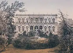 El Marqués de Salamanca encargó en 1846 el proyecto de un palacio-residencia suburbano al arquitecto Narciso Pascual y Colomer, que había saltado a la fama por ganar el concurso para erigir el palacio de las Cortes de España en la carrera de San Jerónimo (Pedro Navascués, sin embargo, afirma que para 1845 el palacio estaba ya en construcción).[2] El banquero acababa de atravesar una buena racha en la bolsa, que había incrementado su fortuna.[2] Para ello eligió los terrenos que había adquirido al conde de Oñate en 1845, un solar de unos doscientos mil pies cuadrados lindando con el Pósito de Madrid que había pertenecido al desamortizado convento de los agustinos recoletos[2] que dio nombre al paseo de Recoletos, un lugar cercano a la plaza de Cibeles. No obstante, a pesar de las prometedoras perspectivas que la zona ofrecía, lo cierto es que la ubicación elegida tenía todavía cierto carácter industrial, debido a la ya citada presencia del Real Pósito o a la de la fábrica de carruajes que, con su enorme chimenea, se encontraba a la espalda de la ubicación elegida, como puede verse en la conocida vista aérea de Madrid que Alfred Guesdon dibujó en 1854,[3] y a poca distancia de la cerca que aún seguía constriñendo la expansión de Madrid.
