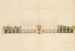 Pascual y Colomer diseñó unos jardines que actuaban de complemento al palacio. Se conserva también una acuarela del propio arquitecto en el que se describe la entrada monumental diseñada para el palacio. En ella aparece una verja situada frente al paseo de Recoletos sostenida por columnas coronadas por bustos. En el centro una puerta monumental similar a la puerta principal del Real Jardín Botánico diseñada por Sabatini: vano de medio punto flanqueado por columnas dóricas, que sostienen un entablamento y un frontón, en el que aparece el escudo del Marqués de Salamanca.[7] A su espalda, aparecían diversos ejemplares del arbolado que comprendía el jardín delantero. Este cierre monumental desapareció en 1859, al alinearse el paseo de Recoletos y perder unos metros la finca por dicho lado.[8]