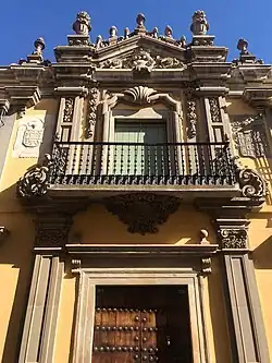 La comunicación entre las galerías baja y alta se resuelve a través de una escalera de gran porte a doble tramo, toda placada de azulejería, cuyo remanso central preside el vistoso escudo heráldico de la familia titular de la mansión, realizado en estuco. Desde el exterior el acceso al palacio se realiza mediante un doble zaguán de transición con bóvedas de arista y puerta de rejería de forja al gusto andaluz, de artística labra, destacando el conjunto de la fachada principal, de hermosa arquitectura, en la que sobresale, por su rica configuración formal, la portada que enfatiza el vano de entrada y el balcón que se sitúa encima, a cuyos costados lucen los emblemas heráldicos de la familia Fernández Daza. Coronando el conjunto se despliega un remate en tímpano con pináculos y cresterías. Del mismo estilo resulta la acusada cornisa que recorre todo el muro y los enmarques de los restantes vanos, los cuales se cierran con buenas rejerías de forja y guardapolvos de teja vidriada componiendo un conjunto de sobria y equilibrada armonía arquitectónica según la traza barroca.