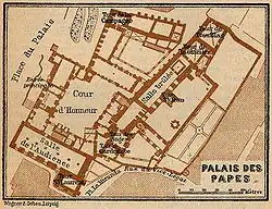 El palacio de los papas (en francés: palais des papes) en Aviñón (Francia) es uno de los edificios góticos más grandes e importantes medievales de Europa. Es uno de los muchos lugares a los que se llama «Palacio de los Papas». Se realizaron en el palacio seis cónclaves en los cuales se llevaron a cabo las elecciones de Benedicto XII (1335), Clemente VI (1342), Inocencio VI (1352), Urbano V (1362), Gregorio XI (1370) y Benedicto XIII (1394). El palacio, que está entrecruzado por dos edificios, es el antiguo palacio de Benedicto XII, una fortaleza asentada en la inexpugnable piedra de Amos, y el nuevo palacio de Clemente VI, el más suntuoso de los papas de Aviñón, ya que no solo es el edificio gótico más grande, sino también en donde se expresa toda la plenitud del estilo del gótico internacional. Es el producto de la construcción y ornamentación de la labor conjunta de los mejores arquitectos franceses, Pierre Peysson y Jean du Louvres —asegura Jean de Loubières—, y los más importantes pintores de frescos de la escuela sienesa, Simone Martini y Matteo Giovanetti.