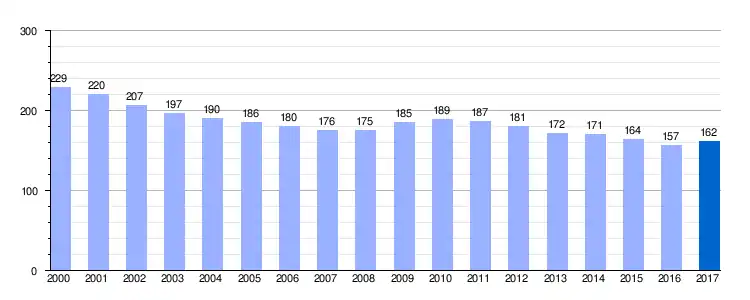 | Gráfica de evolución demográfica de Palazuelo de Órbigo entre 2000 y 2017 |
