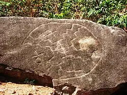 - El Elemento 1 es la roca que se ubica en la parte más alta y una de las principales del complejo arqueológico, se encuentra debajo de una gran saliente rocosa que la protege de la intemperie.[2] Allí se encuentran grabados de tipo antropomorfos (que tiene semejanza con el hombre), zoomorfos (forma o figura de animal) y fitomorfos (forma de plantas). Las antropomorfas escenifican un mito de creación ancestral, la roca tenía tres caras con grabados, una de ellas que miraba hacia el cielo desapareció, se conservan las que miran hacia el oeste y hacia el sur. La del oeste se contemplan cinco pequeñas caras de diferentes tamaños y formas, y en la del sur muestra un grabado esquemático[3] que recrea a dos personas, un hombre y una mujer, con los brazos alzados y con sus dedos de sus manos abiertos.[4] Junto a la piedra en la caverna, se forma en temporada de lluvias una corriente de agua.