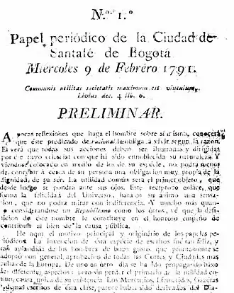 El Papel Periódico de Santafé fue una publicación que circuló en Santafé de Bogotá, Virreinato del Nuevo Reino de Granada, a finales del siglo XVIII. Fue fundada el 9 de febrero de 1791 por Manuel del Socorro Rodríguez.[1] En dicho periódico se le dio cabida a información literaria, política y científica de la época. Se publicó hasta el 6 de enero de 1796 (número 265).[2]
