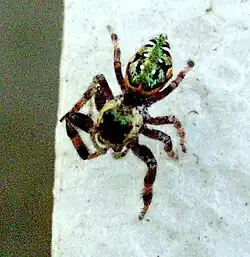 Es una araña perteneciente a la familia Salticidae, del orden Araneae. La coloración es variada, dependiendo el estadio de desarrollo en el cual se encuentre, las hembras y los ejemplares inmaduros presentan un verde iridiscente en el cefalotórax y el abdomen aunque algunos ejemplares llegan a presentar un color más dorado, en lugar de verde; el abdomen presenta una banda en la parte superior dorsal y manchas en la parte dorsal lateral, las cuales pueden ser blancas o naranjas; el cefalotórax presenta la misma coloración verde, con setas blancas o naranjas a la altura de la región ocular. Los machos presentan un marcado dimorfismo sexual, por lo que su coloración es oscura, casi negra; el cefalotórax presenta setas blancas o naranjas solamente en los costados; una característica notable es que los quelíceros son alargados y prominentes; el abdomen presenta, al igual que las hembras, puntos blancos y una banda en la región dorsal superior; el primer par de patas es alargado y tiene flecos blanquecinos.[2][3]