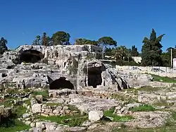 Las latomías son cuevas artificiales creadas por la explotación de las rocas calcáreas como canteras, que posteriormente fueron usadas como prisiones. Su fecha de excavación se ha situado alrededor del siglo V a. C. y se cree que estaría relacionada con la necesidad de piedra para la construcción del barrio de Neápolis.