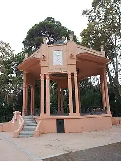 - El Templete de música fue construido en 1932 por de Francisco Maristany en estilo art déco. Cuenta con una planta octogonal de lados desiguales. Posee 3 cuerpos, un basamento sobrio roto por las dos escaleras de acceso decoradas con el escudo de la ciudad timbrado con corona mural, un cuerpo central cerrado por 8 columnas geminadas de capitel corintio que sustentan una cúpula de media naranja que no se refleja en el interior,[2] y que en el exterior está retirada de la envolvente y es tapada por un friso decorado con cuatro plafones escultóricos obra de Carlos Armiño bajo los que aparece el nombre de 4 importantes compositores españoles como Falla, Chapí, Bretón y Giner, junto a las gárgolas de desagüe de la cubierta que se remata con florones. se construyó en hormigón armado, acero en las barandillas, madera en el suelo, la cubierta interior cerrada por una vidriera y la cúpula se reviste con piezas de cerámica vitrificada azules en forma de escama, mientras que los detalles decorativos son de piedra artificial.[12] Se restauró en 1966 eliminando diversos elementos decorativos.[18]