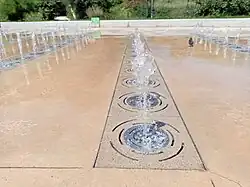 La fuente del parque fue diseñada por la Oficina Técnica Buïgas, creada por Carles Buïgas en 1929. Cuenta con 234 surtidores ubicados en el suelo, en un espacio pavimentado y transitable, dispuestos en trece hileras que permiten que el agua alcance varias alturas. Cada surtidor cuenta con iluminación led de varios colores, que permite crear diversas coreografías.[6]