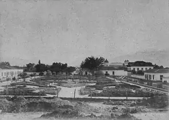 Parque de Bolívar a principios de 1900, se ve la verja de hierro, la fuente de bronce (en rojo), las torres del Templo de la Candelaria (en verde) que era la catedral en esa época, y la casa (en azul) del fotógrafo Pastor Restrepo construida en 1860 y que aún existe pero en un estado de deterioro.[9]