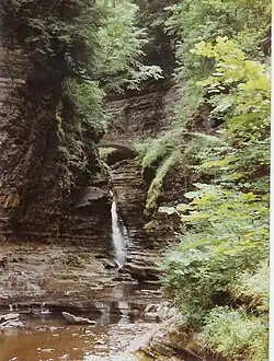 Uno de esos valles colgantes, con vistas al extremo sur del valle del lago Seneca, se convirtió en el profundo desfiladero de Watkins Glen. La empinada caída del arroyo Glen en el valle Seneca creó un poderoso torrente que erosionó la roca subyacente, tallando cada vez más el cauce hacia las cabeceras del arroyo. Esa erosión no fue un proceso uniforme: la roca en el lugar comprende shale, piedra caliza y areniscas, y esos tipos de roca se erosionan a diferentes velocidades, dejando atrás una escalera de cascadas, caídas, pozas y marmitas. El parque estatal Watkins Glen protege abarca diecinueve cascadas espaciadas a lo largo de un sendero de aproximadamente 3,2 km de longitud.[7]