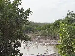 Entre estos dos rasgos hay depresiones que dan lugar a un ambiente lagunar somero, con esporádico contacto con el mar adyacente. Estas cuencas están interrumpidas por caminos transversales que la dividen de forma no natural, restringiendo o impidiendo el flujo de agua. A lo largo de los bordes de las lagunas existen cinturones de manglar, así como algunos parches aislados de las partes centrales de las cuencas, predominando una diversa vegetación de humedales en el resto del área.