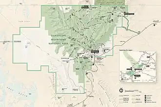 - ↑ a b Flat, Mailing Address: 400 Pine Canyon Salt. «Park Overview - Guadalupe Mountains National Park (U.S. National Park Service)». www.nps.gov (en inglés). Consultado el 29 de septiembre de 2022.