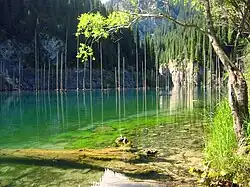 - Lago Kaindy. Ubicado a 11 km al oeste de los lagos Kolsai, el lago Kaindy se encuentra en el río Chilik. El lago es conocido por su reflejo brillante como un espejo y troncos sumergidos de abetos secos se elevan por sobre la superficie. Fue creado en 1911, cuando un terremoto causó un deslizamiento que bloqueó un extremo de la garganta.[7]