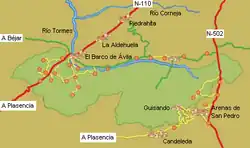 El Arenal, Bohoyo, Los Guijuelos, Navamediana, Navamojada, La Carrera, Cereceda, Lancharejo, Navalmoro, Gilgarcía, Guisando, El Hornillo, Hoyos del Collado, Hoyos del Espino, Los Llanos de Tormes, Navalonguilla, Cabezas Bajas, Navatejares, Puerto Castilla, Santiago de Aravalle, La Aliseda de Tormes, Navacepeda de Tormes, San Martín del Pimpollar, Los Loros, Mazalinos, Los Narros, Santa Lucía de la Sierra, Serranía, Solana de Ávila, Tremedal, La Zarza, Navamures, Tormellas, Ávila, Casas de Maripedro, Casas del Abad, Hustias, Retuerta, Umbrías, Venta de Veguillas, Angostura de Tormes, Hermosillo, Nava del Barco y Casas del Puerto de Tornavacas.