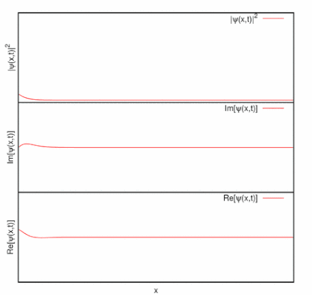 Es fácil comprobar que para este sistema el operador Hamiltoniano conmuta con el operador momento y, por tanto, existe un conjunto completo de soluciones comunes. La solución correspondiente a valores definidos de la energía y del momento viene dada por una onda plana: