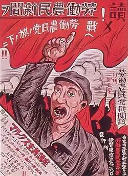 La izquierda revolucionaria también se dividió en filas propias. Después de la disolución del primer partido comunista japonés en 1924, los cuadros de izquierda se habían unido al Partido Laborista-Agrario. Un sector (el grupo Fukumoto) quería reconstituir el Partido Comunista y concentró su trabajo en la organización clandestina, mientras que Sakai Toshihiko, Yamakawa Kikue, Yamakawa Hitoshi y sus simpatizantes se centraron en la construcción del Partido Laborista-Agricultor legal.[15] A fines de 1926, el grupo Fukomoto dominaba tanto al Partido Comunista reconstituido como al Partido Laborista-Agricultor, ocupando posiciones estratégicas clave dentro de este último.[16]
