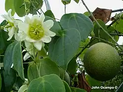 Planta herbácea trepadora, glabra; tallo cilíndrico; estípulas foliáceas, asimétricamente ovado o reniforme-auriculadas, de 0.5 a 1.5 cm de largo y 0.6 a 2 cm de ancho, caedizas, peciolos de 1 a 3 cm de largo, desprovistos de glándulas, hojas peltadas, a 3 a 5 mm de distancia de la base, ampliamente ovadas, de 5 a 10 cm de largo y 3.5 a 8 cm de ancho, enteras a levemente trilobadas hacia el tercio superior; flores solitarias, sobre pedúnculos hasta de 2 cm de largo, brácteas 2 (o raras veces con una tercera más pequeña), de (1)2.5 a 3 cm de largo y (0.8)1.5 a 2 cm de ancho; flores solitarias, blancas o de color crema, de 4 a 6 cm de diámetro; sépalos y pétalos similares entre sí, oblongos, de 2 a 3 cm de largo por 7 a 9 mm de ancho; paracorola formada por 2 series de filamentos amarillos, los exteriores hasta de 1.5 cm de largo, los interiores algo más cortos, capitados; androginóforo de unos 4 mm de largo, anteras de 4.5 mm de largo; estilos de alrededor de 5 mm de largo, estigmas de 1.5 mm de diámetro; fruto globoso, verde a azul-negro, de 3 a 4.5 cm de diámetro, glabro; semillas ovado-oblongas, de 5 a 7 mm de largo por 4 mm de ancho, reticuladas.[1]