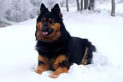 Tiene un tamaño y peso medio (49 a 55 cm de altura y pesa alrededor de 18 a 25 kg). El pelaje es largo y denso, con abundante subpelo, que le permite sobrevivir en climas hostiles. Tiene una silueta rectangular armoniosa: compacto y bien proporcionado con orejas de inserción alta, pequeñas, puntiagudas, y erguidas, con el hocico es negro. El trote es fluido, ligero y sin prisas, lo que es una de las características típicas de esta raza.