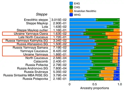 Cuando se publicaron las primeras secuencias genómicas completas de miembros de la cultura Yamna en 2015, se informó que los individuos yamnaya no tenían ascendencia de agricultores anatolios,[2][30][27] pero tras estudios más amplios, ahora se acuerda generalmente que los yamnaya tenían aproximadamente un 14 % de ascendencia de agricultores anatolios, junto con un pequeño componente WHG, que no estaba presente en los individuos de la estepa eneolítica anterior.[29][12][31]