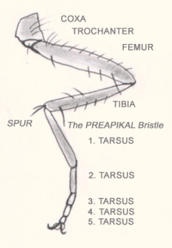 Diagrama de una pata de insecto. Coxa, trocanter, fémur, tibia, tarso (segmentos uno a cinco).