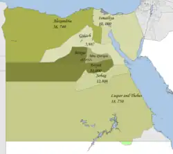 El patriarcado tiene como sufragáneas a las eparquías de: Abu Qurqas, Al Qusia, Alejandría, Asiut, Guiza, Ismailía, Luxor, Menia y Suhag.