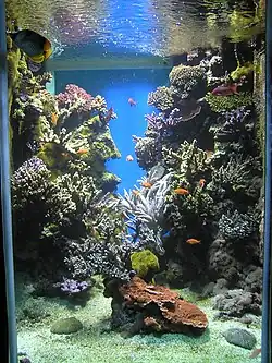 - Acuarios de agua salada: los que cuentan con una concentración salina de entre 0,5 y 3,8 %. En ellos se recrea un ambiente de arrecife, costero u oceánico. Han demostrado ser los más difíciles de mantener y estabilizar por las peculiaridades del agua salada. Para Paletta et al. (1999, p. 19) o Hargrove y Hargrove (2011, p. 20), todos son acuarios marinos, pese a reconocer ciertas diferencias, punto de vista no compartido por Scott (1995, p. 130 a 146), quien sí los trata de forma distinta.