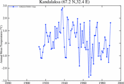 El clima es riguroso, con temperaturas muy bajas y un predominio de la tundra, excepto en el sur, por donde se extiende la taiga y pueden encontrarse algunos bosques de abedules, abetos y pinos. La termografía correspondiente a Kandalakcha, denota la falta de urbanización que generaría la isla de calor.