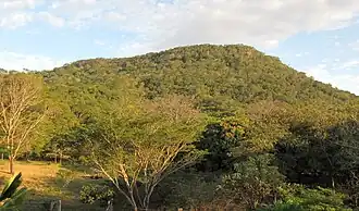 La topografía no supera los 1000 m de altitud, sin embargo, el relieve es muy accidentado,[9] representado principalmente por los cerros de Nicoya y los cerros de Barra Honda. El sistema montañoso de la península está constituido por el Complejo de Nicoya, cuyos cerros más altos son el cerro Azul (1018 m s. n. m.), cerro vista al mar (980 m s. n. m.), cerro mata de caña (972 m s. n. m.), cerro Esperanza (920 m s. n. m.), cerro Madrigal (835 m s. n. m.), el cerro Frío (756 m s. n. m.) y el cerro Pozo (755 m s. n. m.).[7]