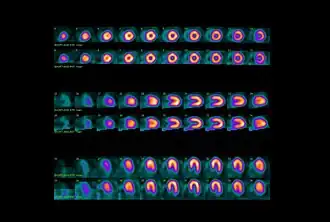 La perfusión miocárdica es una práctica médica que se basa en el uso de radiofármacos (ej: 99mTc-MIBI), los cuales se administran mediante inyección endovenosa (vaso sanguíneo) y se concentran en el tejido miocárdico (2% de la dosis administrada) fijándose en las mitocondrias, pues solo atraviesa las membranas de las células vivas y permiten evaluar indirectamente la irrigación (perfusión) global y regional del ventrículo izquierdo y su viabilidad.