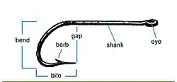 El uso del anzuelo en la pesca con caña desciende, históricamente, de los pueblos antiguos usaban gargantas para capturar peces y animales como focas, morsas y pájaros. Una garganta era una pieza larga y delgada de hueso o piedra unida por su punto medio a una línea delgada. Se cebaría la garganta para que descansara paralelo al trazado de la línea. Cuando la presa se tragaba el anzuelo, un tirón en la línea haría que la garganta se orientara en ángulo recto a la línea, lo que se atascaría en la garganta o el esófago del pez o del animal. La garganta evolucionó hasta convertirse en el anzuelo de pesca moderno, que es un alambre en forma de J con un lazo en un extremo y una punta afilada en el otro. La mayoría de los anzuelos tienen una púa cerca de la punta para evitar que el pez se desenganche mientras se enrolla. Algunas leyes y reglamentos exigen que los anzuelos no tengan púas. Esta regla se implementa comúnmente para proteger poblaciones de ciertas especies. Un anzuelo de púas podría matar a un pez si penetrara en las branquias.[3]