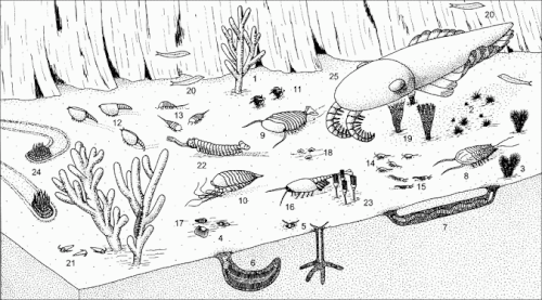 - ↑ Dzik, J.; Lendzion, K. (1988). «The Oldest Arthropods of the East European Platform.». Lethaia 21: 29-38.