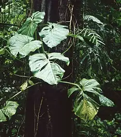 Son hemiepífitas, con entrenudos de 1–6 cm de largo cerca del ápice y de 2.5–12 cm de diámetro; catáfilos 2-acostillados, verde obscuros, persistentes como fibras. Hojas estrechamente agrupadas cerca del ápice, ampliamente ovadas, 22–64 cm de largo y 18–52 cm de ancho, profundamente lobadas en la base, seno parabólico a hipocrepiforme, costilla posterior no desnuda en las plantas juveniles, tornándose desnuda a 2.5 cm de su punto de unión al pecíolo; pecíolos en forma de D, 15–95 cm de largo y 5–15 mm de diámetro, con los márgenes superiores delgados, patentes, 4–5 mm de alto, generalmente undulado-alados. Inflorescencias numerosas en cada una de las axilas superiores, pedúnculo de 5–12 cm de largo; espata 12–26 cm de largo y 1.5–3.5 cm de ancho, muy contraída entre el tubo y la lámina, tubo 6–9 cm de largo y 1.5–3.5 cm de ancho, purpúreo por fuera y rojizo por dentro, lámina verde por fuera y morado-violeta por dentro; espádice 15–20 cm de largo, apenas proyectado hacia afuera de la espata en la antesis; porción pistilada 3–5 cm de largo y 10–12 mm de diámetro, verde pálida; porción estaminada más ancha que la pistilada, angostamente ahusada hacia el ápice. Bayas blancas.[1]