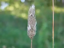 Planta perenne, derecha, sin pelos amacollada, muchos tallos desde la macolla, sobrepasa el metro de altura. Flores o espiguillas en espiga más o menos largas, de 17 x 1 cm las mayores, cilíndricas, el color de la espiga aún es verde en el verano. Muchísimas espículas apretadas, sin rabillo. con 2 glumas iguales, terminadas en una arista rígida de 1,5 mm, continuación de la quilla y de color verde con pelos blancos abiertos. Dentro de las glumas hay glumelas casi transparentes, desiguales y con nervios apenas visibles, 3 estambres y una semilla o cariopsis. Todo el conjunto de 3,5 x 1,5 mm. Hojas hasta 25 cm de longitud y 10-12 mm de anchura, envainadoras, lígula o lengüeta apretada y blanca, de 4 mm, ásperas, rayadas, terminadas en una larga y estrecha punta, hojas abundantes en la cepa. Tallos redondos, suaves, muy rectos, pero acodados en la base. Raíz engrosada en un nudo y una cabellera de raicillas.[1]