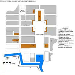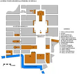 En realidad, las nuevas construcciones edificadas a partir de los primeros años del siglo XVII se limitaron a alinearse a los edificios colocados alrededor de la plaza, formando así un espacio de dimensiones alargadas, cerrado al sur por la Catedral y al norte por el llamado Porticciolo dei Genovesi, una pequeña dársena preexistente que data del siglo XV. A los lados de dicha dársena se elevaron las principales sedes del poder público: el Palazzo Granducale, el Palazzo del Governatore, el Palazzo della Dogana y, posteriormente, el Palazzo Comunale.