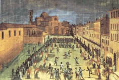 La Piazza Santo Spirito, como las otras grandes plazas florentinas situadas delante de las iglesias de las órdenes mendicantes (Piazza Santa Croce, Piazza Santa Maria Novella...), ha sido desde la Edad Media uno de los lugares de la ciudad dedicados a la celebración de fiestas, juegos y eventos.