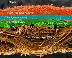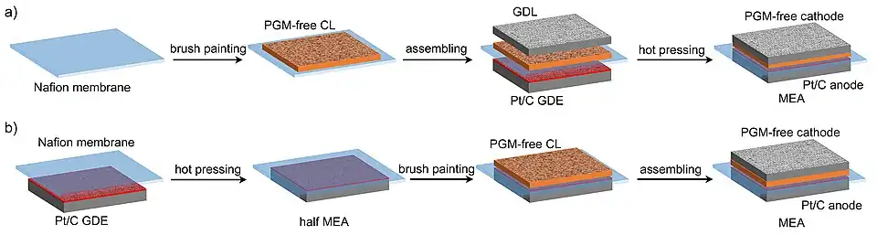 - ↑ a b Yin, Xi; Lin, Ling; Chung, Hoon T; Komini Babu, Siddharth; Martinez, Ulises; Purdy, Geraldine M; Zelenay, Piotr (4 de agosto de 2017). «Effects of MEA Fabrication and Ionomer Composition on Fuel Cell Performance of PGM-Free ORR Catalyst». ECS Transactions 77 (11): 1273-1281. Bibcode:2017ECSTr..77k1273Y. doi:10.1149/07711.1273ecst.