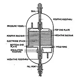 El electrodo positivo está formado por una placa de níquel porosa sinterizada en seco, que contiene hidróxido de níquel. El electrodo negativo de hidrógeno utiliza un catalizador negro de platino ligado con teflón con una carga de 7 mg/cm2 y el separador es un tejido de zirconia (ZYK-15 Zircar).[18][19]