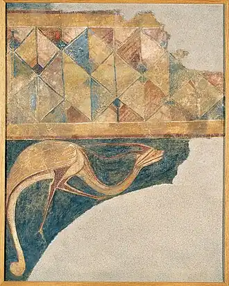 La mayor parte de la pintura mural románica conservada es de temática religiosa, pero también podemos encontrar decoraciones de carácter cortesano o profano en grandes centros monásticos, como es el caso de San Pedro de Arlanza, en Castilla. Este fragmento proviene de una sala de carácter palatino de la llamada Torre del Tesoro, sobre la sala capitular, donde había representaciones zoomórficas inspiradas en el bestiario. Hoy vemos en estas pinturas un grifo, ser fantástico con cuerpo de león y torso de águila, en una actitud vigilante. El estilo de las pinturas de Arlanza se relaciona con otras obras hispánicas del 1200 de clara influencia de la miniatura inglesa, lo cual puede apreciarse en el refinamiento y la precisión de los motivos, combinado con su monumentalidad.